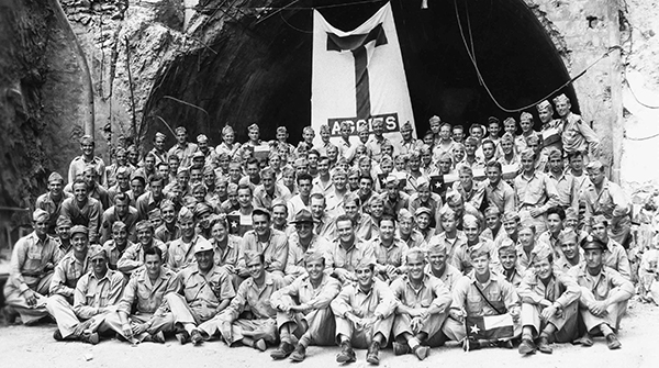 When World War II ended in 1945, the Filipinos were liberated from Japanese occupation. Over 100 Aggie soldiers returned once more to the island of Corregidor the following spring in 1946 to stand at the mouth of Malinta Tunnel and call the Muster for lives lost during the war. They used a table cloth as an improvised Aggie flag and hung it over the tunnel as they stood at attention singing “The Spirit of Aggieland.”