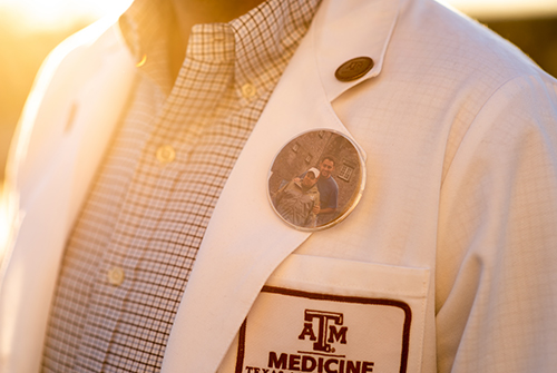 Rhett wears a pin with a photo of him and his brother, Ashley, on his medical coat.