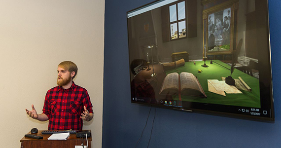 Reid Tracy '15, a Triseum game designer, demonstrates "Arté Mecenas.”
