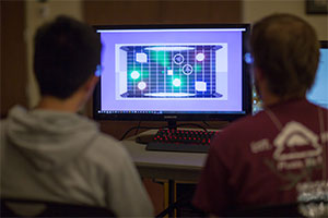 This year’s competition consisted of 35 students who, working alone or in teams limited to four members, created one or more desktop games using the software of their choice. Throughout the two-day, non-stop competition, industry professionals roamed the floor, offering contestants game development advice and networking opportunities.
