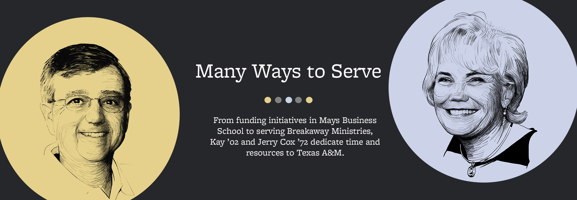 Kay '02 and Jerry Cox '72 have made a major impact on Texas A&M University and Mays Business School by donating their time and funds.